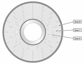 これはハードディスクでは周速と呼びますが、ヘッドの下を通過するビットの量が最外周と最内周では2:1の差があり、一定のビット密度でヘッドの下を通過するデータ量はメディア内周に進むに従って減って行きます。これは、Zone-Bit(右図参照)とよばれるハードディスクの論理セクターのフォーマット方式により、最外周部分には多くのセクターを最内周部分には少ないセクターを論理的配置し、メディア外周部分の記録密度を向上させているためです。